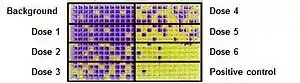 In the 96-well plate method the frequency of mutation is counted as the number of wells out of 96 which have changed color. The plates are incubated for up to five days, with mutated (yellow) colonies being counted each day and compared to the background rate of reverse mutation using established tables of significance to determine the significant differences between the background rate of mutation and that for the tested samples.