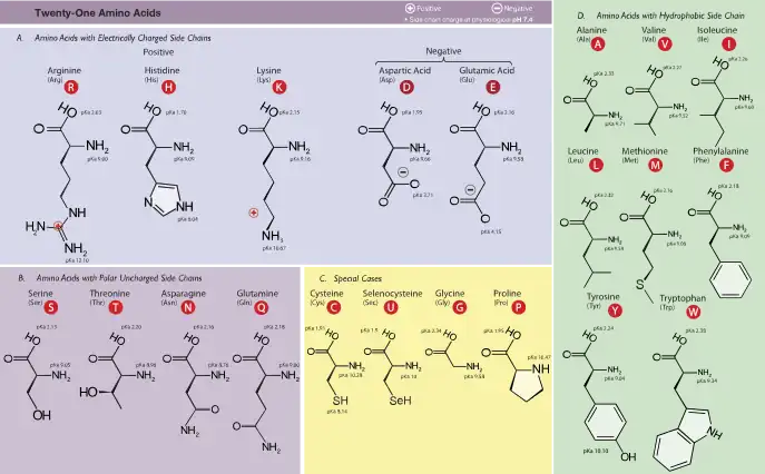 The 21 proteinogenic α-amino acids found in eukaryotes, grouped according to their side chains' pKa values and charges carried at physiological pH (7.4)
