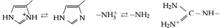 There are three amino acids with side chains that are cations at neutral pH: arginine (Arg, R), lysine (Lys, K) and histidine (His, H). Arginine has a charged guanidino group and lysine a charged alkyl amino group, and are fully protonated at pH 7. Histidine's imidazole group has a pKa of 6.0, and is only around 10 % protonated at neutral pH. Because histidine is easily found in its basic and conjugate acid forms it often participates in catalytic proton transfers in enzyme reactions.[26]