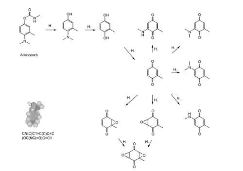 Aminocarb undergoes hydrolysis to 4-dimethylamino-3-methylphenol in 25 °C purified water when pH of the water is 6.4. 4-dimethylamino-3-methylphenol is then either directly or via 2-methyl-1,4-dihydorquinone converted to 2-methyl-1,4-benzoquinone. If methylamine or diethylamine are present in the solution 2-methyl-1,4-benzoquinone will readily react. Monoepoxides and diepoxides of 2-methyl-1,4-benzoquinone are formed.[6]