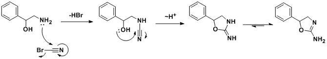 The racemic synthesis involves addition/cyclization reaction of 2-amino-1-phenylethanol with cyanogen bromide.[8] A similar synthesis has been also published.[9] In a search for a cheaper synthetic route, a German team developed an alternative route[10] which, by using chiral styrene oxide, allows an enantiopure product.