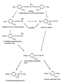 As illustrated in figure 3 the first step is a hydrolysis reaction to N-methyl-N'-(2,4-xylyl)-formamidine, which already can be excreted in the urine but is still pharmacological active.[20][21] Depending on the dose, the quantity of this metabolite in the urine can vary from 4% at low doses to 23%-38% at high doses (e.g. in case of rats: 1–100 mg per kg body weight).[20] As it isn't excreted it also can be oxidized to 4-N-Methyl-formidoyl)amino-meta-toluic acid, which can be further oxidized to 4-formamido-meta-toluic acid.[20] Form-2,4-xylidine is formed directly by hydrolysis from amitraz or arises from N-methyl- N'-(2,4-xylyl)formamidine.[21] During this early stage of biotransformation N-methyl- N'-(2,4-xylyl) formamidine and Form-2,4-xylidine may already form conjugates.[20] But the major route followed after the formation of Form-2,4-xylidine is the oxidation to 4-formamido-meta-toluic acid, which is further metabolized to its acetyl conjugate, 4-acetamido-meta-toluic acid or 4-amino- meta-toluic acid.[20][21] 4-formamido- meta-toluic acid and 4-acetamido- meta-toluic acid make 32% of the metabolites found in urine and are detected at any administered dose. Therefore, they are considered as two of the major metabolites in the amitraz pathway.[20] Form-2',4'-xylidide and 4-amino- meta-toluic acid account only for 2% of the total excretion.[20] In insects different metabolites are formed. N-methyl- N'-(2,4-xylyl)formamidine, Form-2,4-xylidine and 4-Amino-meta-toluic acid occur, but in addition several unidentified metabolites were detected, too.[21]