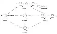 N,N'-bis-dimethylphenylformamidine (BTS 28 037) can be transformed to 2,4-dimethylformanilide (BST 27 919) or directly react to 2,4-dimethylaniline (BTS 24 868), but the exact mechanisms of these biotransformations are not known yet.[8] However, of 2,4-dimethylaniline (BTS 24 868) and N,N'-bis-dimethylphenylformamidine (BTS 28 037) less than 1% has been accounted, which makes them minor metabolites compared to N-(2,4-dimethylphenyl)-N'-methylformamidine (BST 27 271) and 2,4-dimethylformanilide (BST 27 919).[8] Figure 4 shows the suggested amitraz' metabolic pathway in plants.[8]