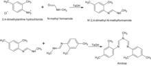 The first step of this synthesis route to an N-arylformamidine as amitraz is the reaction of a substituted formamide, usually a dialkylformamide, with an aniline.[6] To gain amitraz N-methyl formamide and 2,4 dimethyl aniline hydrochloride can be used (figure 2). This reaction is catalyzed by the presence of acid halides, such as POCl3, SOCl2, COCl2, or an arylsulfonylhalide, as p-toluene sulfonyl chloride (figure 2).[7][18] This yields an intermediate, which reacts further as its catalyzed by p-toluene acid to N, N'-[(methylimino) dimethylidyne] di-2,4-xylidine (amitraz).[18] Alternatively, the aniline in the first step can be replaced by an arylformamide. In addition the replacement of the dialkylformamide with an N-alkylpyrrolidone can be used to obtain products of the clenpyrin group from this reaction.[7]