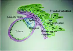 The yolk sac, amnion, chorion, and allantois are the four extraembryonic membranes that lie outside of the embryo and are involved in providing nutrients and protection to the developing embryo.[5] They form from the inner cell mass; the first to form is the yolk sac followed by the amnion which grows over the developing embryo. The amnion remains an important extraembryonic membrane throughout prenatal development. The third membrane is the allantois, and the fourth is the chorion which surrounds the embryo after about a month and eventually fuses with the amnion.[6]