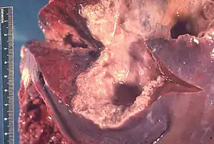 A amoebic liver abscess is a type of liver abscess caused by amebiasis.[1] It is the involvement of liver tissue by trophozoites of the organism Entamoeba histolytica and of its abscess due to necrosis.