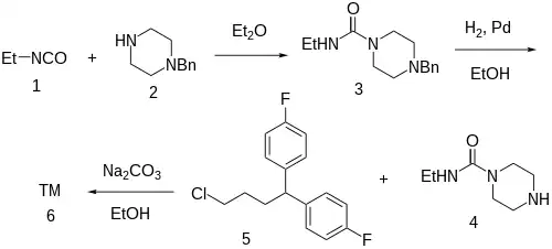 The reaction of ethylisocyanate [109-90-0] (1) with N-benzylpiperazine (2) leads to the corresponding urea, CID:47103368 (3). Catalytic hydrogenation cleaves the benzyl protecting group giving N-ethylpiperazine-1-carboxamide [75529-72-5] (4). Alkylation of the unmasked nitrogen with 1,1'-(4-Chlorobutylidene)Bis(4-Fluorobenzene) [3312-04-7] (5) completed the synthesis of amperozide (6).