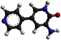 Amrinone, also known as inamrinone, and sold as Inocor, is a pyridine phosphodiesterase 3 inhibitor.[1] It is a drug that may improve the prognosis in patients with congestive heart failure.[2] Amrinone has been shown to increase the contractions initiated in the heart by high-gain calcium induced calcium release (CICR).[3] The positive inotropic effect of amrinone is mediated by the selective enhancement of high-gain CICR, which contributes to the contraction of myocytes by phosphorylation through cAMP dependent protein kinase A (PKA) and Ca2+ calmodulin kinase pathways.[3]