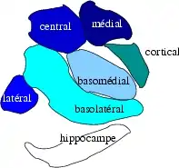 The regions described as amygdala nuclei encompass several structures of the cerebrum with distinct connectional and functional characteristics in humans and other animals.[5] Among these nuclei are the basolateral complex, the cortical nucleus, the medial nucleus, the central nucleus, and the intercalated cell clusters. The basolateral complex can be further subdivided into the lateral, the basal, and the accessory basal nuclei.[3][6][7]