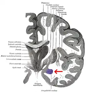 The amygdalae are also involved in appetitive (positive) conditioning. It seems that distinct neurons respond to positive and negative stimuli, but there is no clustering of these distinct neurons into clear anatomical nuclei.[38][39] However, lesions of the central nucleus in the amygdala have been shown to reduce appetitive learning in rats. Lesions of the basolateral regions do not exhibit the same effect.[40] Research like this indicates that different nuclei within the amygdala have different functions in appetitive conditioning.[41][42] Nevertheless, researchers found an example of appetitive emotional learning showing an important role for the basolateral amygdala: The naïve female mice are innately attracted to non-volatile pheromones contained in male-soiled bedding, but not by the male-derived volatiles, become attractive if associated with non-volatile attractive pheromones, which act as unconditioned stimulus in a case of Pavlovian associative learning.[43] In the vomeronasal, olfactory and emotional systems, Fos (gene family) proteins show that non-volatile pheromones stimulate the vomeronasal system, whereas air-borne volatiles activate only the olfactory system. Thus, the acquired preference for male-derived volatiles reveals an olfactory-vomeronasal associative learning. Moreover, the reward system is differentially activated by the primary pheromones and secondarily attractive odorants. Exploring the primary attractive pheromone activates the basolateral amygdala and the shell of nucleus accumbens but neither the ventral tegmental area nor the orbitofrontal cortex. In contrast, exploring the secondarily attractive male-derived odorants involves activation of a circuit that includes the basolateral amygdala, prefrontal cortex and ventral tegmental area. Therefore, the basolateral amygdala stands out as the key center for vomeronasal-olfactory associative learning.[44]