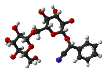 Amygdalin is hydrolyzed by intestinal β-glucosidase (emulsin)[12] and amygdalin beta-glucosidase (amygdalase) to give gentiobiose and L-mandelonitrile. Gentiobiose is further hydrolyzed to give glucose, whereas mandelonitrile (the cyanohydrin of benzaldehyde) decomposes to give benzaldehyde and hydrogen cyanide. Hydrogen cyanide in sufficient quantities (allowable daily intake: ~0.6 mg) causes cyanide poisoning which has a fatal oral dose range of 0.6–1.5 mg/kg of body weight.[13]