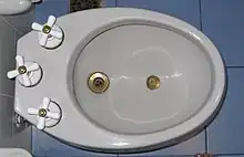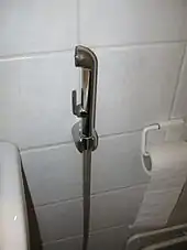In predominantly Catholic countries,[9] Eastern Orthodox,[10] Hindu, Buddhist and Muslim cultures, and in some Protestant countries such as Finland,[11] as well as in Southeast Asia and Southern Europe and Latin America,[12] water is usually used for anal cleansing, using a jet (e.g., bidet shower, bidet) or vessel (e.g., lota, aftabeh), and a person's hand (in some places only the left hand is used). Cleaning with water is sometimes followed by drying the anal region and hand with a cloth towel or toilet paper. On the other hand, in some parts of developing countries and during camping trips, materials such as vegetable matter (leaves), mudballs, snow (water), corncobs, and stones are sometimes used for anal cleansing.[13][14] Having hygienic means for anal cleansing available at the toilet or site of defecation is important for overall public health. The absence of proper materials in households can, under some circumstances, be correlated to the number of diarrhea episodes per household.[15] The history of anal hygiene, from ancient Rome and Greece to China and Japan, involves sponges and sticks as well as water and paper.