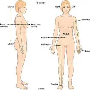 • Proximal and distal, which describe a position that is closer to (proximal) or farther from (distal) the trunk of the body.[1] For example, the shoulder is proximal to the arm, and the foot is distal to the knee.