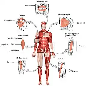 The gross anatomy of a muscle is the most important indicator of its role in the body. One particularly important aspect of gross anatomy of muscles is pennation or lack thereof. In most muscles, all the fibers are oriented in the same direction, running in a line from the origin to the insertion. In pennate muscles, the individual fibers are oriented at an angle relative to the line of action, attaching to the origin and insertion tendons at each end. Because the contracting fibers are pulling at an angle to the overall action of the muscle, the change in length is smaller, but this same orientation allows for more fibers (thus more force) in a muscle of a given size. Pennate muscles are usually found where their length change is less important than maximum force, such as the rectus femoris.[16]