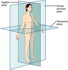The three anatomical planes of the body: the sagittal, transverse (or horizontal), frontal planes