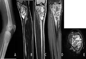 | A. X-ray: osteolytic lesion in tibia near knee. B/C/D/E. MRI with E showing fluid levels. | |