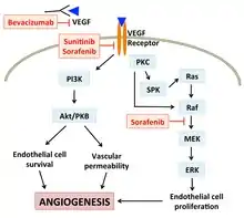 Mechanism of action of angiogenesis inhibitors. Bevacizumab binds to VEGF inhibiting its ability to bind to and activate VEGF receptors. Sunitinib and Sorafenib inhibit VEGF receptors. Sorafenib also acts downstream.