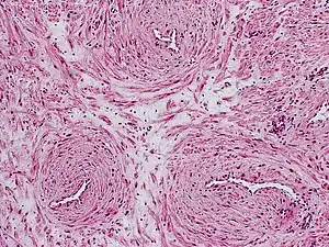 Angioleiomyoma, smooth muscles encircling dilatated blood vessels