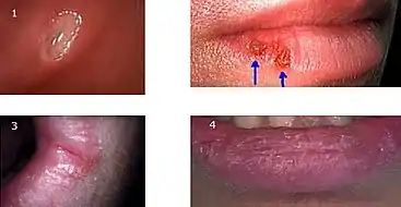 Angular cheilitis is a fairly non specific term which describes the presence of an inflammatory lesion in a particular anatomic site (i.e. the corner of the mouth). As there are different possible causes and contributing factors from one person to the next, the appearance of the lesion is somewhat variable. The lesions are more commonly symmetrically present on both sides of the mouth,[4] but sometimes only one side may be affected. In some cases, the lesion may be confined to the mucosa of the lips, and in other cases the lesion may extend past the vermilion border (the edge where the lining on the lips becomes the skin on the face) onto the facial skin. Initially, the corners of the mouth develop a gray-white thickening and adjacent erythema (redness).[2] Later, the usual appearance is a roughly triangular area of erythema, edema (swelling) and breakdown of skin at either corner of the mouth.[2][4] The mucosa of the lip may become fissured (cracked), crusted, ulcerated or atrophied.[2][4] There is not usually any bleeding.[7] Where the skin is involved, there may be radiating rhagades (linear fissures) from the corner of the mouth. Infrequently, the dermatitis (which may resemble eczema) can extend from the corner of the mouth to the skin of the cheek or chin.[4] If Staphylococcus aureus is involved, the lesion may show golden yellow crusts.[8] In chronic angular cheilitis, there may be suppuration (pus formation), exfoliation (scaling) and formation of granulation tissue.[2][4]