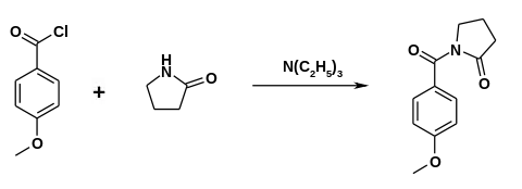Alternatively, gamma-aminobutyric acid can react with anisoyl chloride. Ring closure can be accomplished in the presence of thionyl chloride.[15]