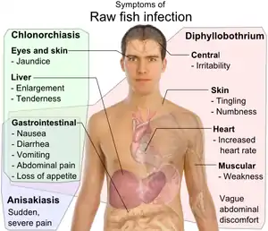 | Differential symptoms of parasite infection by raw fish: Clonorchis sinensis (trematode/fluke), Anisakis (nematode/roundworm) and Diphyllobothrium (cestode/tapeworm),[7] all have gastrointestinal, but otherwise distinct, symptoms.[8][9][10][11] | |