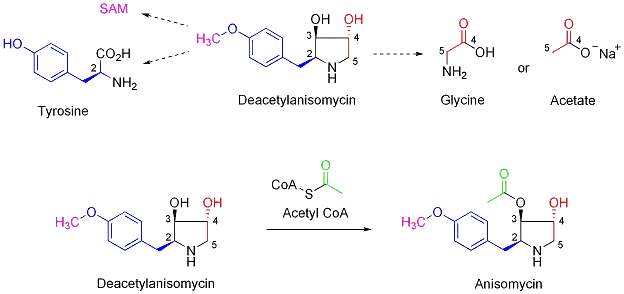Because of anisomycin's wide use as a protein synthesis inhibitor, there have been many studies centered on the biosynthesis of anisomycin. One study by Butler in 1974 proposed possible precursors to this natural product. Fermentation of Streptomyces with labeled amino acids was followed by a degradation of the radioactive anisomycin and deacetylanisomycin products to determine the locations of the labeled carbons. Although its pyrrolidine-based structure suggests that it is derived from proline, the results from the experiments indicated that tyrosine, glycine, methionine, and acetate are the primary precursors for the biosynthesis of anisomycin. Tyrosine and, to a limited degree, phenylalanine, contribute to C-2 of the pyrrolidine ring. Methionine is likely responsible for the methylation of the hydroxyl group on the aromatic ring as S-adenosylmethionine (SAM). Glycine or acetate account for C-4 and C-5 on the pyrrolidine ring. It was noted that deacetylanisomycin was a prominent product in the first few days of fermentation, suggesting that acetylation of the C-3 hydroxyl group by acetyl Co-A is the final step in the biosynthesis of anisomycin. The source of the nitrogen within the ring and C-3 were undetermined. However, C-3 is not likely to be provided by the carboxylic acid group of tyrosine because tracking of radioactivity indicated that tyrosine undergoes decarboxylation during fermentation.[6]