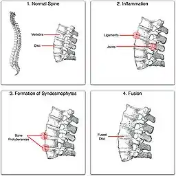 Prognosis is related to disease severity.[9] AS can range from mild to progressively debilitating and from medically controlled to refractory. Some cases may have times of active inflammation followed by times of remission resulting in minimal disability while others never have times of remission and have acute inflammation and pain, leading to significant disability.[9] As the disease progresses, it can cause the vertebrae and the lumbosacral joint to ossify, resulting in the fusion of the spine.[48] This places the spine in a vulnerable state because it becomes one bone, which causes it to lose its range of motion as well as putting it at risk for spinal fractures. This not only limits mobility but reduces the affected person's quality of life. Complete fusion of the spine can lead to a reduced range of motion and increased pain, as well as total joint destruction which could lead to a joint replacement.[49]