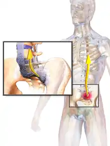 AS can occur in any part of the spine or the entire spine, often with pain localized to either buttock or the back of the thigh from the sacroiliac joint. Arthritis in the hips and shoulders may also occur. When the condition presents before the age of 18, AS is more likely to cause pain and swelling of large lower limb joints, such as the knees.[11] In prepubescent cases, pain and swelling may also manifest in the ankles and feet where heel pain and enthesopathy commonly develop.[11] Less common occurrences include ectasia of the sacral nerve root sheaths.[12]