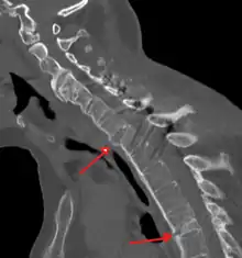 Osteoporosis is common in ankylosing spondylitis, both from chronic systemic inflammation and decreased mobility resulting from AS. Over a long-term period, osteopenia or osteoporosis of the AP spine may occur, causing eventual compression fractures and a back "hump".[50] Hyperkyphosis from ankylosing spondylitis can also lead to impairment in mobility and balance, as well as impaired peripheral vision, which increases the risk of falls which can cause fracture of already-fragile vertebrae.[50] Typical signs of progressed AS are the visible formation of syndesmophytes on X-rays and abnormal bone outgrowths similar to osteophytes affecting the spine. In compression fractures of the vertebrae, paresthesia is a complication due to the inflammation of the tissue surrounding nerves.