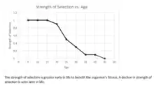 An antagonistically pleiotropic gene can be selected for if it has beneficial effects in early life while having its negative effects in later life because genes tend to have larger impacts on fitness in an organism's prime than in their old age.[5] An example of this is testosterone levels in male humans. Higher levels of this hormone lead to increased fitness in early life, while causing decreased fitness in later life due to a higher risk for prostate cancer.[16] This is an example of antagonistic pleiotropy being an explanation for senescence. Senescence is the act of ageing in individuals; it's the failure over time of the individual's life processes by natural causes.[17] Williams's theory has been the motivation for many of the experimental studies on the reasons for aging in the last 25 years.[18] However, there is more than one theory out there for aging. The competing model to explain senescence is Medawar's "mutation accumulation" hypothesis, saying that "over evolutionary time, late-acting mutations will accumulate at a much faster rate than early-acting mutation. These late-acting mutations will thus lead to declining viability and/or fertility as an organism ages."[18] Medawar's theory is based around the older concept of selection shadow that had been discussed throughout the early 1900s and led to Medawar's theory after discussions with J. B. S. Haldane in the 1940s.[19]