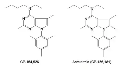 The synthesis of CP-154,526, a non-peptide antagonist of the CRH1 receptor, was first described in 1997.[6] Antalarmin, or CP-156,181, is a close analog that is highly structurally similar and has been shown to be easier to synthesize.[2] The findings from several chemical, pharmacokinetic and pharmacological studies indicate that the two compounds possess very similar properties.