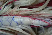 ![]() 1: Posterior spinal vein 2: Anterior spinal vein 3: Posterolateral spinal vein 4: Radicular (or segmental medullary) vein 5: Posterior spinal arteries 6: Anterior spinal artery 7: Radicular artery | |