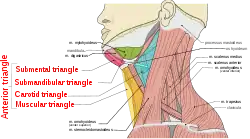 | Superior boundary (base) | The lower border of the body of the mandible, and a line extending from the angle of the mandible to the mastoid process |