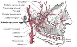 The anterior tympanic artery (glaserian artery) is a branch of (the mandibular part of) the maxillary artery.[1] It passes through the petrotympanic fissure[1][2] to entre the middle ear where it contributes to the formation of the circular anastomosis around the tympanic membrane.[2] It provides artieral supply to part of the lining of the middle ear.[1] It is accompanied by the chorda tympani nerve.[1]