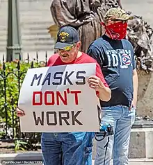 Mask-wearing has been seen as an example of a generational divide by some, with older adults who refused to wear masks being seen as selfish.[17] In addition, men have been seen as more likely to refuse wearing masks, seeing them as a threat to their masculinity.[18][19] Refusal to wear face masks is also linked to vaccine hesitancy or anti-vaccination sentiment, political conservatism,[20] rural dwelling,[21][22] and non-adherence to public hygiene rules, or social distancing guidelines.[15] Other factors which may make people less likely to wear masks includes a low death rate due to pandemic disease in one's hometown, and low mask-wearing among one's peers.[23]