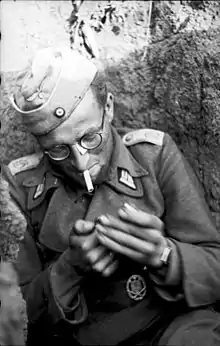 Smoking was common in the Wehrmacht; a 1944 survey found that 87% of servicemen smoked. 10% of servicemen had begun smoking while in the military, and only seven servicemen of the thousand surveyed (0.7%) had given it up.[1] However, as in the general population, the number of smokers rose while the number of cigarettes smoked fell. As a result of the anti-tobacco measures implemented in the Wehrmacht (supply restriction, taxes, and propaganda),[1] the total tobacco consumption by soldiers decreased between 1939 and 1945.[21] Average tobacco consumption per person among military personnel declined by 23.4% compared to the immediate pre-World War II years. The number of servicemen who smoked 30 or more cigarettes per day (well above the theoretical maximum military ration of 7.7 cigarettes per day)[78] declined from 4.4% to 0.3%.[1]