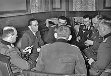 Smoking was also banned not only in health care institutions, but also in several public offices and in rest homes.[1] Midwives were restricted from smoking while on duty. Smoking was also outlawed in bomb shelters; however, some shelters had separate rooms for smoking.[1] In 1939, the Nazi Party outlawed smoking in all of its offices premises, and Heinrich Himmler, the then chief of the Schutzstaffel (SS), restricted police personnel from smoking while they were on duty.[60] In 1938, the Reichspost imposed a ban on smoking.[1] However, despite public encourage against smoking, bans on smoking were seldom enforced and ineffective.[61][62] Among Nazi leadership, Hermann Goering smoked cigars, and Himmler and Joseph Goebbels smoked cigarettes, as did Magda Goebbels and Eva Braun, Hitler's romantic partner.[63][62]