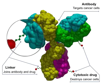 ADCs are complex molecules composed of an antibody linked to a biologically active cytotoxic (anticancer) payload or drug.[3] Antibody-drug conjugates are an example of bioconjugates and immunoconjugates.