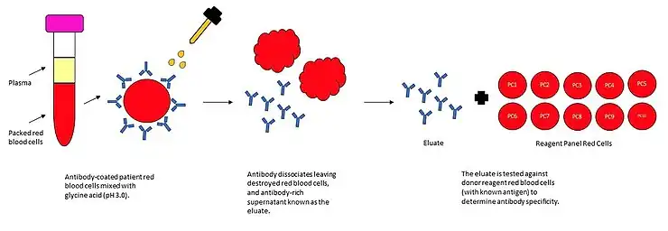 An antibody elution is a clinical laboratory diagnostic procedure which removes sensitized antibodies from red blood cells, in order to determine the blood group system antigen the antibody targets.[1] An antibody elution is deemed necessary when antibodies of the immunoglobulin class G (IgG) are found sensitized (bound) to peripheral red cells collected from a blood product transfusion recipient.[2] IgG antibodies are detected using an assay known as the direct antiglobulin test.[3]