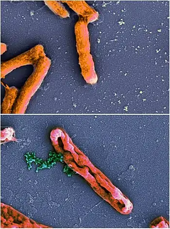 Scanning electron microscopic images (50,000X magnification) displaying the action of an experimental antimicrobial peptide (NN2_0050) on the cell membrane of E. coli (K12 MG1655) ABOVE: Intact cell membranes in the control group. BELOW: Disrupted cell membranes and leakage of bacterial chromosome (green) in the treated group.