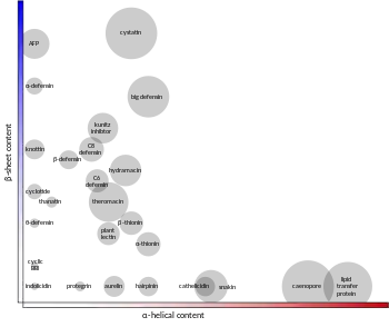Antimicrobial peptides from animals, plants and fungi organised by their secondary structure content. Circle size indicates overall molecular weight of each peptide.
