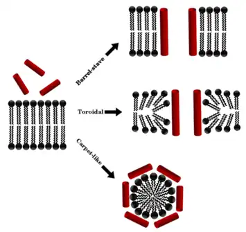 • Disordered toroidal-pore model: According to this model, the disordered AMPs wrap around the lipid bilayer and create a pore, which disrupts the membrane's integrity and leads to the death of the microbe. Unlike the toroidal model, which suggests that the AMP creates a stable toroidal structure, the disordered toroidal-pore model suggests that the AMP is flexible and does not form a stable toroidal structure. The peptide-lipid pore complex becomes intrinsically disordered, with the orientation of the peptide not well defined.[21]