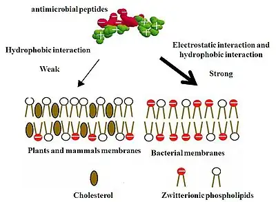 In contrast, the outer part of the membranes of plants and mammals is mainly composed of lipids without any net charges since most of the lipids with negatively charged headgroups are principally sequestered into the inner leaflet of the plasma membranes.[44] Thus in the case of mammalian cells, the outer surfaces of the membranes are usually made of zwitterionic phosphatidylcholine and sphingomyelin, even though a small portion of the membrane's outer surfaces contain some negatively charged gangliosides. Therefore, the hydrophobic interaction between the hydrophobic face of amphipathic antimicrobial peptides and the zwitterionic phospholipids on the cell surface of mammalian cell membranes plays a major role in the formation of peptide-cell binding.[48]