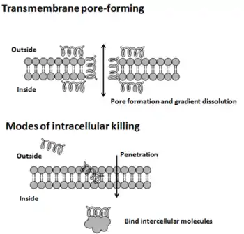 The modes of action by which antimicrobial peptides kill microbes are varied,[10] and may differ for different bacterial species.[11] Some antimicrobial peptides kill both bacteria and fungi, e.g., psoriasin kills E. coli and several filamentous fungi.[12] The cytoplasmic membrane is a frequent target, but peptides may also interfere with DNA and protein synthesis, protein folding, and cell wall synthesis.[10] The initial contact between the peptide and the target organism is electrostatic, as most bacterial surfaces are anionic, or hydrophobic, such as in the antimicrobial peptide Piscidin. Their amino acid composition, amphipathicity, cationic charge and size allow them to attach to and insert into membrane bilayers to form pores by ‘barrel-stave’, ‘carpet’ or ‘toroidal-pore’ mechanisms. Alternately, they may penetrate into the cell to bind intracellular molecules which are crucial to cell living.[13] Intracellular binding models includes inhibition of cell wall synthesis, alteration of the cytoplasmic membrane, activation of autolysin, inhibition of DNA, RNA, and protein synthesis, and inhibition of certain enzymes. In many cases, the exact mechanism of killing is not known. One emerging technique for the study of such mechanisms is dual polarisation interferometry.[14][15] In contrast to many conventional antibiotics these peptides appear to be bactericidal[2] instead of bacteriostatic. In general the antimicrobial activity of these peptides is determined by measuring the minimal inhibitory concentration (MIC), which is the lowest concentration of drug that inhibits bacterial growth.[16]