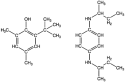 Synthetic phenolic antioxidants (SPAs) and aminic antioxidants have potential human and environmental health hazards. SPAs are common in indoor dust, small air particles, sediment, sewage, river water and wastewater.[25] They are synthesized from phenolic compounds and include 2,6-di-tert-butyl-4-methylphenol (BHT), 2,6-di-tert-butyl-p-benzoquinone (BHT-Q), 2,4-di-tert-butyl-phenol (DBP) and 3-tert-butyl-4-hydroxyanisole (BHA). BHT can cause hepatotoxicity and damage to the endocrine system and may increase tumor development rates due to dimethylhydrazine.[26] BHT-Q can cause DNA damage and mismatches[27] through the cleavage process, generating superoxide radicals.[25] DBP is toxic to marine life if exposed long-term. Phenolic antioxidants have low biodegradability, but they do not have severe toxicity toward aquatic organisms at low concentrations. Another type of antioxidant, diphenylamine (DPA), is commonly used in the production of commercial, industrial lubricants and rubber products and it also acts as a supplement for automotive engine oils.[28]
