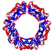 Peroxiredoxins are peroxidases that catalyze the reduction of hydrogen peroxide, organic hydroperoxides, as well as peroxynitrite.[119] They are divided into three classes: typical 2-cysteine peroxiredoxins; atypical 2-cysteine peroxiredoxins; and 1-cysteine peroxiredoxins.[120] These enzymes share the same basic catalytic mechanism, in which a redox-active cysteine (the peroxidatic cysteine) in the active site is oxidized to a sulfenic acid by the peroxide substrate.[121] Over-oxidation of this cysteine residue in peroxiredoxins inactivates these enzymes, but this can be reversed by the action of sulfiredoxin.[122] Peroxiredoxins seem to be important in antioxidant metabolism, as mice lacking peroxiredoxin 1 or 2 have shortened lifespans and develop hemolytic anaemia, while plants use peroxiredoxins to remove hydrogen peroxide generated in chloroplasts.[123][124][125]