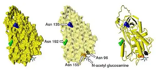 Recombinant antithrombins with properties similar to those of normal human antithrombin have been produced using baculovirus-infected insect cells and mammalian cell lines grown in cell culture.[14][15][16][17] These recombinant antithrombins generally have different glycosylation patterns to normal antithrombin and are typically used in antithrombin structural studies. For this reason many of the antithrombin structures stored in the protein data bank and presented in this article show variable glycosylation patterns.