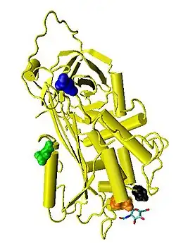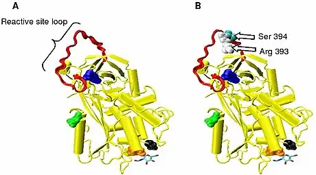 Protease inactivation results as a consequence of trapping the protease in an equimolar complex with antithrombin in which the active site of the protease enzyme is inaccessible to its usual substrate.[12] The formation of an antithrombin-protease complex involves an interaction between the protease and a specific reactive peptide bond within antithrombin. In human antithrombin this bond is between arginine (arg) 393 and serine (ser) 394 (see Figure 2 and Figure 3).[12]