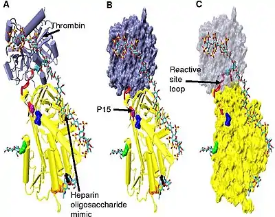 Upon binding to this pentasaccharide sequence, inhibition of protease activity is increased by heparin as a result of two distinct mechanisms.[29] In one mechanism heparin stimulation of Factor IXa and Xa inhibition depends on a conformational change within antithrombin involving the reactive site loop and is thus allosteric.[30] In another mechanism stimulation of thrombin inhibition depends on the formation of a ternary complex between AT-III, thrombin, and heparin.[30]