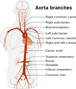 The aorta (/ˈɔːrtə/ ay-OR-tə) is the main and largest artery in the human body, originating from the left ventricle of the heart, branching upwards immediately after, and extending down to the abdomen, where it splits at the aortic bifurcation into two smaller arteries (the common iliac arteries). The aorta distributes oxygenated blood to all parts of the body through the systemic circulation.[1]